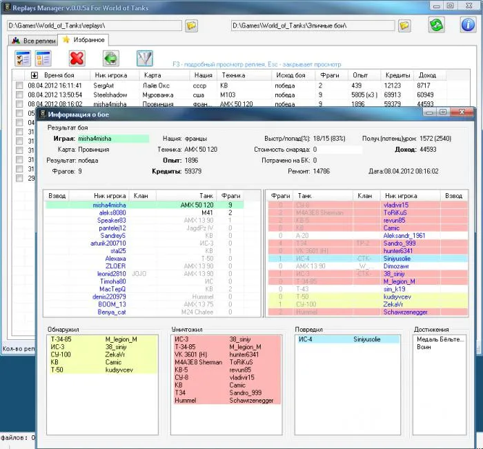 Многие могут с уверенностью сказать, что существует программа для воспроизведения WoT под названием Replay Manager. Однако, как следует из названия программы, ее цель — распределить накопленные вами повторения по различным категориям. Программа также может отображать информацию о сражениях, составе команды, завоеванных наградах и т.д