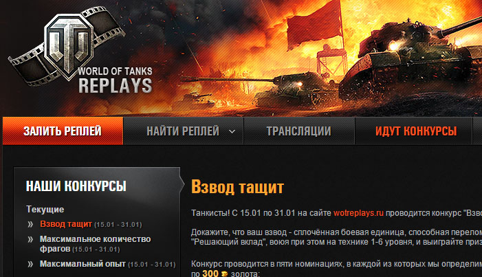 . На нём можно залить свой бой, скопировать на него ссылку и отправить для просмотра другу любым удобным способом. На данном проекте собрано множество профессиональных сражений, которые можно смотреть в любое время и стремиться быть лучше. Запускать реплеи можно прямо с сайта, не устанавливая дополнительных программ. Помимо всего прочего, есть возможность скачивать для просмотра в другое время, или же смотреть прямую трансляцию в любой точке мира. А также участвовать в конкурсах, побеждать и прокачивать свой танк!