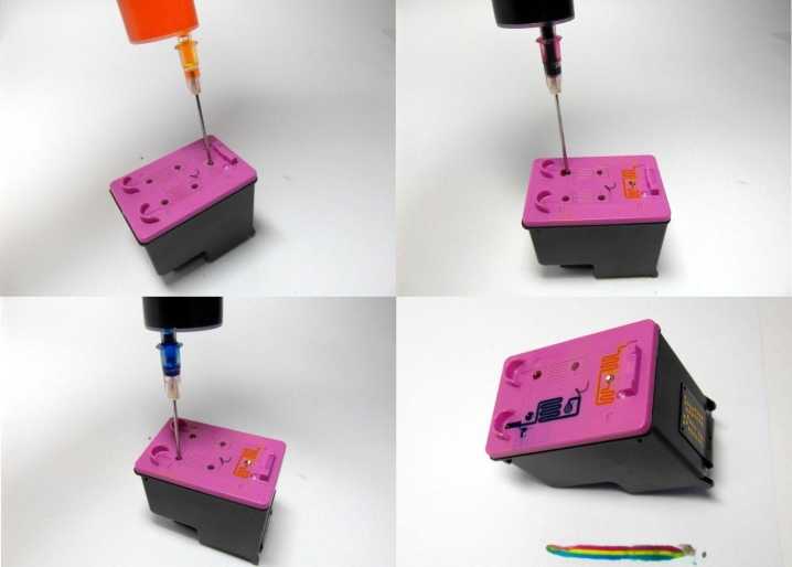 Определить какой вариант, функционирует в вашем принтере не так уж и сложно. Можно прижать картридж со стороны печатной головы к туалетной бумаге и посмотреть по отпечатку, куда и какие чернила необходимо заливать. Некоторые предпочитают определять заправочное отверстие с помощью шприца. Опустив иглу, можно посмотреть в какой цвет она окрасилась или немного откачать чернила в шприц.