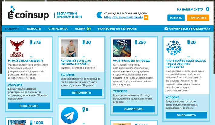 CoinsUP – наверное, самый популярный проект такого формата. Здесь есть и простые задания типа «Прочитайте текст вслух, чтобы обучить нейросеть» и более сложные наподобие «Достигните 6 уровня в игре Небеса». Накопленную валюту можно вывести как на счет World of Tanks, так и на аккаунты других популярных игры, Steam и даже 4game. Хоть сам я уже давненько не играл в WOT, ссылку я указал реферальную. Дивиденды от вашей активности будут потрачены на акции от tankigames.ru, так что заглядывайте к нам почаще