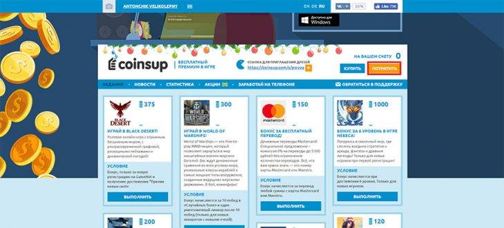 World of Tanks – невероятно популярная игра, так что в интернете давно поняли, что она способна приносить прибыль буквально из ничего. В данном способе перейдите на сайт https://coinsup.com и зарегистрируйтесь. Затем приступайте к выполнению любого задания. Чтобы вывести местную валюту, нажмите на кнопку «потратить», которую вы можете увидеть на скриншоте ниже.