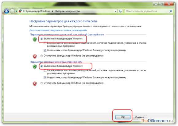 Впрочем, в Windows есть свой брандмауэр, который рекомендуется не отключать. По сути, это системный фаервол, который следует выключить лишь при наличии сетевого защитника сторонней компании. Чтобы включить брандмауэр Windows, нужно открыть панель управления, перейти в пункт «Брандмауэр Windows» и кликнуть слева «Включение/отключение брандмауэра Windows». В новом окне ставим метки рядом с «Включение» и кликаем «ОК».