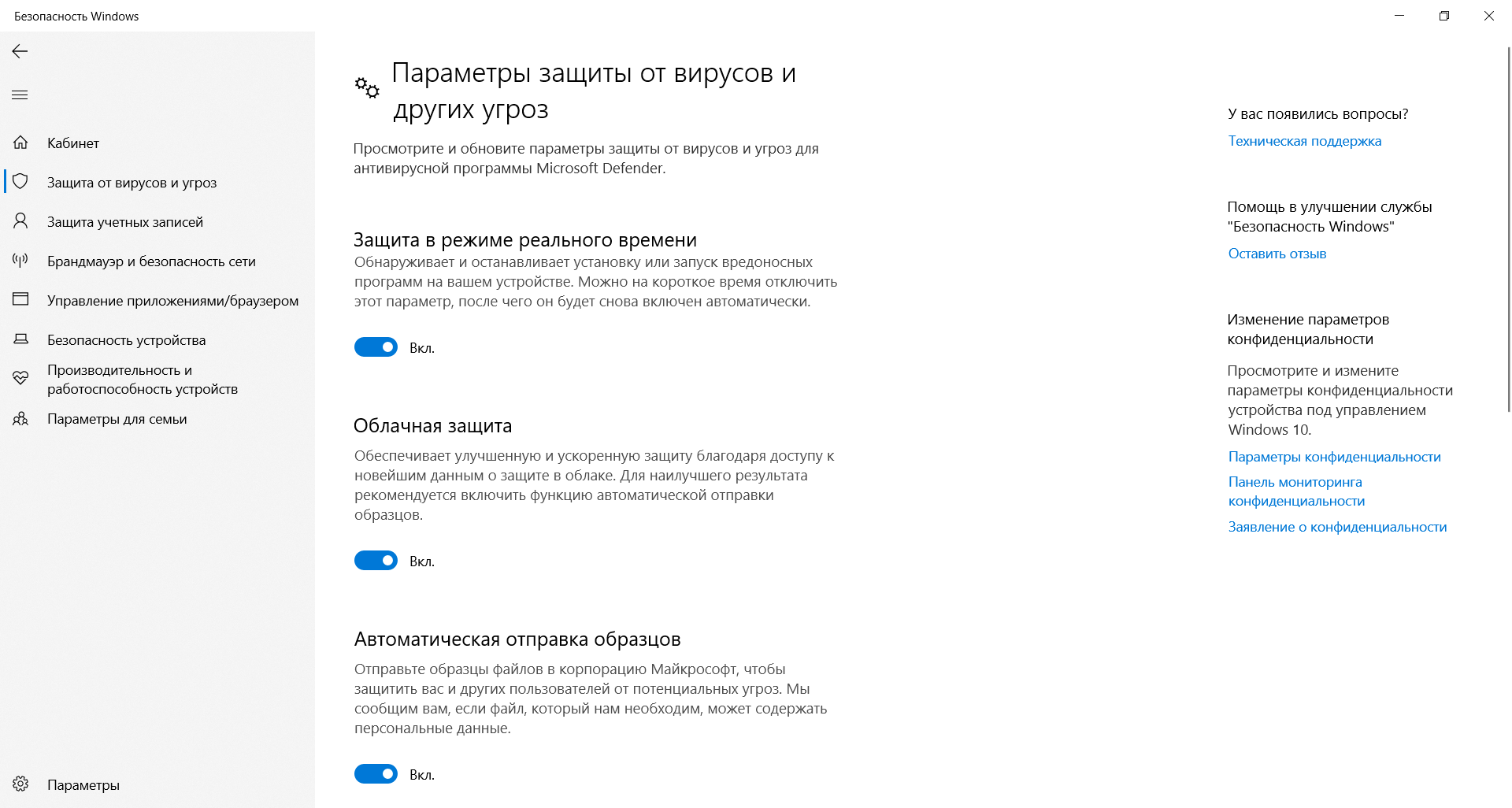 - Автоматическая отправка образцов. Передает подозрительные файлы службе поддержки Microsoft для изучения и выработки наилучшей защиты от новых угроз.