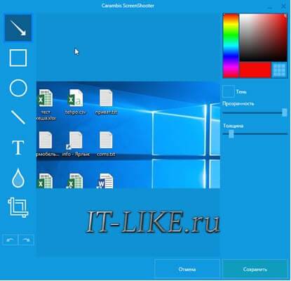 Здесь можно нарисовать стрелки, различные фигуры, добавить текст с настраиваемой прозрачностью, нумерацию, обрезать изображение. Нажимаем на кнопку «Сохранить». Можно нажать на значок программы в системном трее возле часиков и работать оттуда: