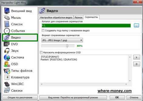 Light Alloy делает скриншоты после нажатия кнопки F12. Чтобы указать каталог для сохранения скриншотов – войдите в меню программы, перейдите на вкладку «Видео» — «Скриншоты» и укажите путь для сохранения скриншотов.