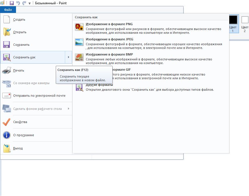 в меню надо нажать «Сохранить как». В появившемся справа поле, можно выбрать из списка формат: PNG, JPEG, BMP, GIF;