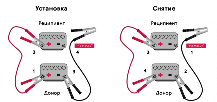 Если аккумулятор «умер» окончательно и бесповоротно, при этом у вас нет времени его заряжать, на помощь может прийти донор, от которого можно “прикурить” аккумулятор. В этом случае нужно соединить два аккумулятора (донор и севшую батарею) по схеме выше.