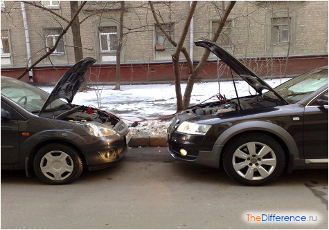 - использование автомобиля-донора. При этом с соблюдением полярности соединяется АКБ замерзшей машины с АКБ другого, уже работающего автомобиля, а затем можно попытаться завести вашего «железного коня». Необходимо убедиться, что в момент запуска двигатель прогретой машины заглушен.