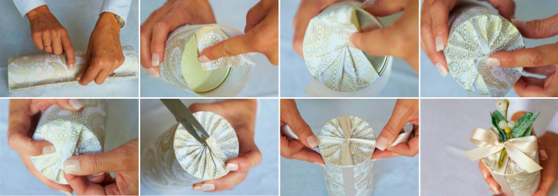 Как оборачивать коробку в подарочную бумагу, если упаковка сферической формы? Поставьте её в центр отреза торцом, заверните и соедините скотчем обе стороны. Аккуратно загибайте и складывайте бумагу в складки, сначала на дне, а затем со стороны крышки. Оберните лентой и украсьте объёмной аппликацией или маленьким букетом из сухоцветов.