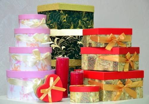 Преимущество стоит отдать плотным компонентам упаковки, которые смогут держать форму. Также не стоит сильно туго заворачивать подарки – они и без того могут помяться или потерять форму. Платья и шляпки лучше преподносить в больших коробках с наполнителями из искусственных цветов.