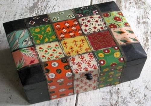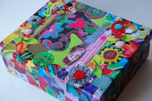 Упаковка коробки в стиле пэчворг из собранных кусочков яркой ткани с использованием тесьмы, ленточек, пуговиц, покрытая сверху лаком