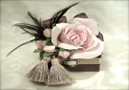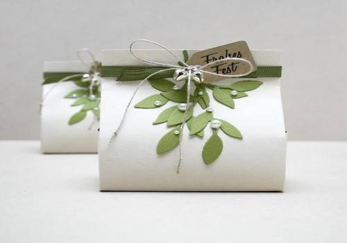 - Дизайнерские украшения. В оригинальных упаковках в качестве декоративных украшений используются рукодельные цветы, ягоды, травы, колокольчики, пуговицы, бисер, пайетки, камни, перья и др. Украшения добавляются на верхнюю часть коробки. Выбор дизайнерских изделий зависит от сезона и случая, по которому приобретен подарок. Например, красные ягоды, хвойные ветки и маленькие шишки подходят для подарков на зимние праздники.
