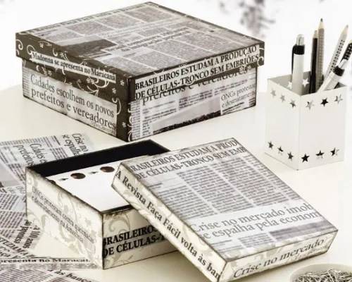 Коробка, обклеенная газетой или специальной бумагой с изображением печатной продукции с использованием черной туши или копировальной бумаги для придания ей винтажности