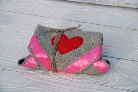 Для образа мужских презентов можно подобрать текстильную упаковку. Если женщина владеет техникой шитья, можно украсить полотно лентами и декоративными матерчатыми вставками.