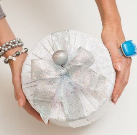 Второй вариант – завернуть в круглую форму, создав «плацдарм» из бумаги и газет. Они хорошо будут держать форму, не давая презенту деформироваться.