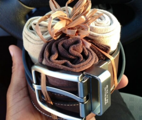 Хотели подарить достойный презент, но не понимаете, как упаковать ремень в подарок, который в принципе сложно как-то оригинально оформить? Используйте его не по прямому назначению – пусть он побудет средством для создания упаковки, а «внутрь» такого оформления поместите какие-нибудь отвлекающие товары.