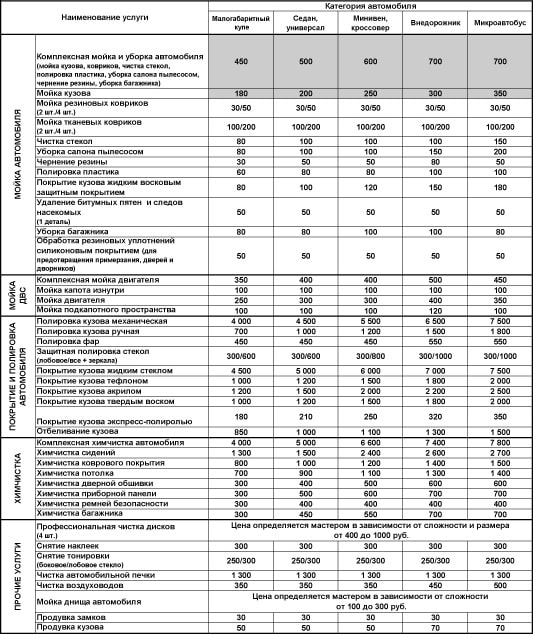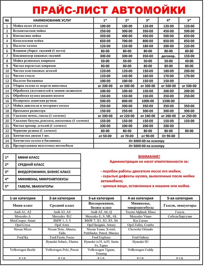 Пример прайс-листов (цены на услуги) действующих автомоек: