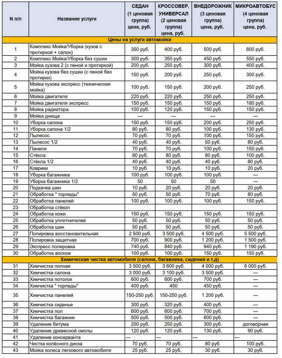 Пример прайс-листов (цены на услуги) действующих автомоек: