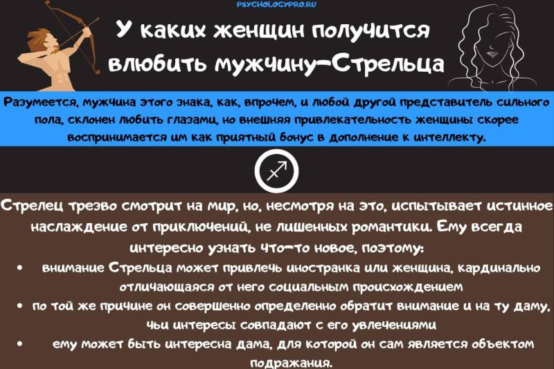 Его привлекают общительные женщины, с разносторонними взглядами, с кем можно без конца размышлять о жизни, узнавать новое, делиться своими размышлениями. Если же найти еще общие занятия и увлечения, то это еще больше сблизит с мужчиной Стрельцом. Он натура увлекающая, не сидит долго на одном на месте и ему хочется, чтобы женщина разделяла его увлечения, чтобы вместе с ней заниматься любимым делом.
