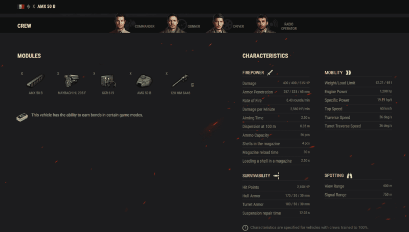 Среди всех блоков показателей AMX 50 B следует выделить мобильность, превышающую обычные для данного класса характеристики, в частности: