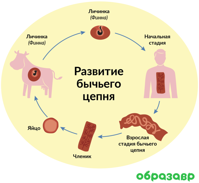 Если человек съест заражённое мясо, то станет окончательным хозяином бычьего цепня. В человеке финна превращается во взрослую особь.