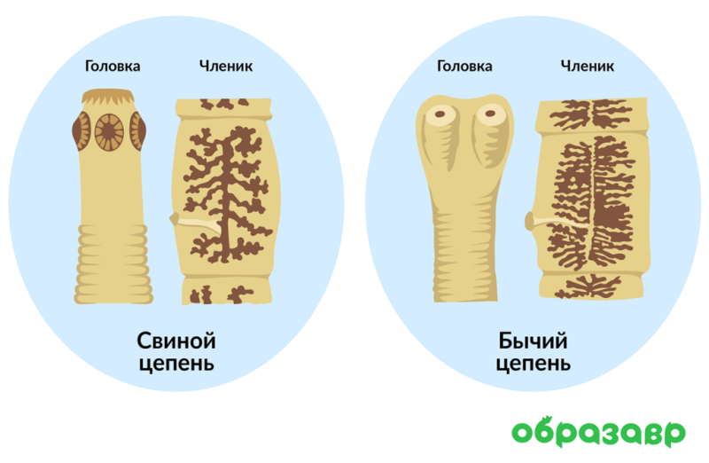 Бычий цепень достигает 10 м в длину, свиной — вырастает до 8 м.