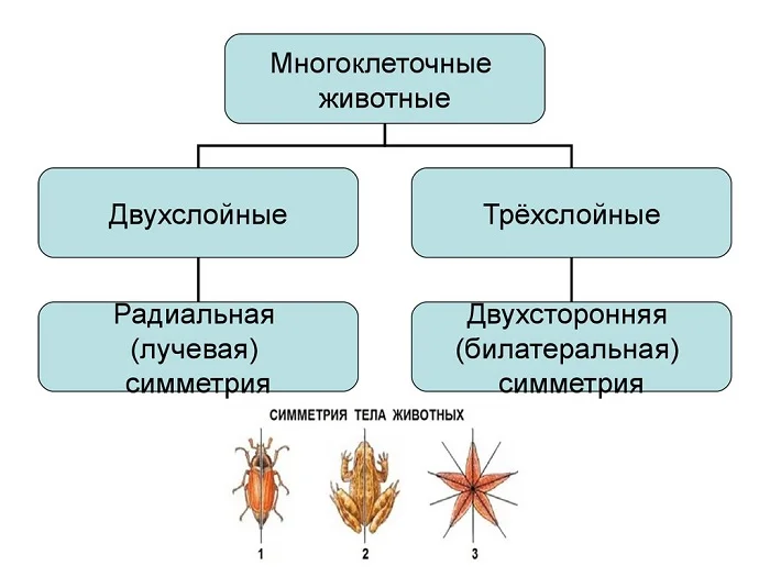 Также для животных с радиальной симметрией характерно наличие двух слоёв: наружного (эктодермы) и внутреннего (энтодермы). Для животных с билатеральной симметрией характерно наличие трёх слоёв: наружного (эктодермы), внутреннего (энтодермы) и среднего (мезодермы).