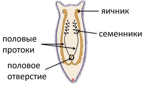 В организме гермафродитов находятся и женские органы размножения (яичники), и мужские органы размножения (семенники). Половые клетки выходят по половым протоком через половое отверстие во внешнюю среду, где и происходит оплодотворение.