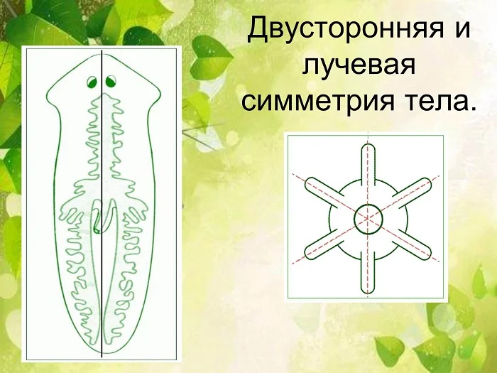 Далее у животных выработалась двусторонняя симметрия. По-другому её называют билатеральной. Если у животного двусторонняя симметрия, то сквозь его организм возможно построить лишь одну ось симметрии так, что организм разделится на две равноценные доли. К животным с билатеральной симметрией относятся все остальные животные. Плоские черви — животные, имеющие двустороннюю симметрию.
