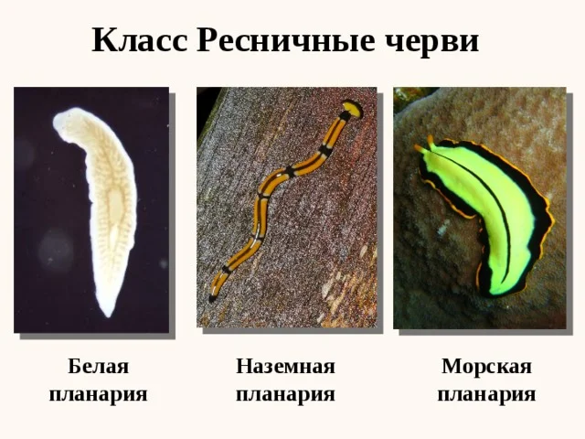 Типичный представитель ресничных червей — молочная (белая) планария длиной 1–3 см и толщиной 1 мм. Места обитания — стоячие или медленно текущие пресные водоемы, где планарии питаются мелкими беспозвоночными.