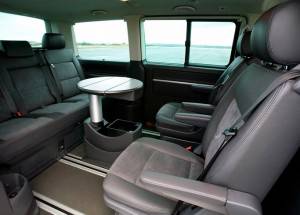 Отличительная черта Мультивена – поразительная подверженность трансформации. Кресла можно поворачивать и передвигать как угодно. Посередине салона расположен удобный откидной столик.