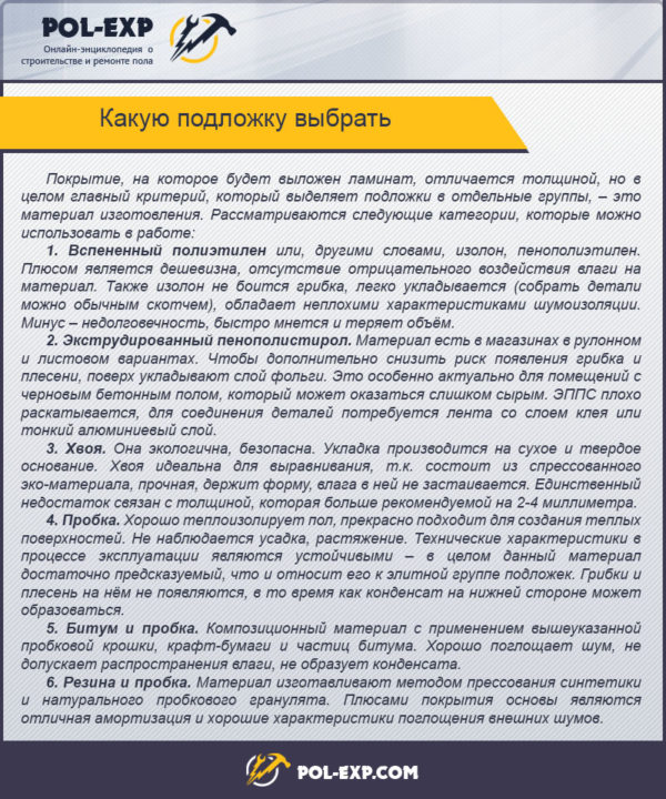 В продаже бывает ламинат, когда подложка уже приклеена к детали, однако с позиции цены лучше все же приобрести рулоны или листы и выложить их согласно инструкции, приведенной далее.