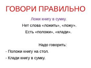 Стараемся избегать просторечных слов, не являющихся литературными. Учитывая, что речь является визитной карточкой каждого человека, будем стремиться употреблять слова «класть», «положить» и их формы повелительного наклонения правильно.