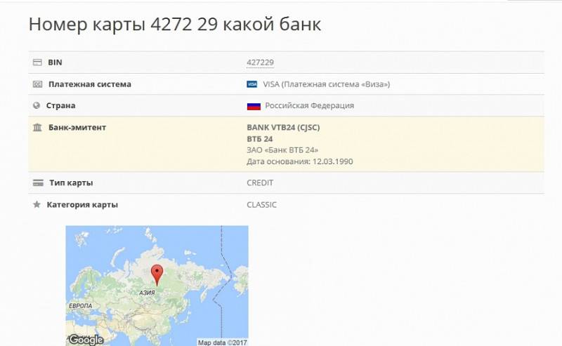 Если шифр достоверен, в новом окне будет прописана информация о стране и эмитенте, выпустившим карточку, ее типе.