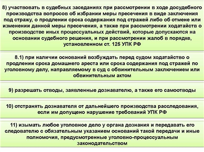 Полномочия следователя довольно обширны, по сравнению с полномочиями дознавателя. Среди таковых следует выделить: