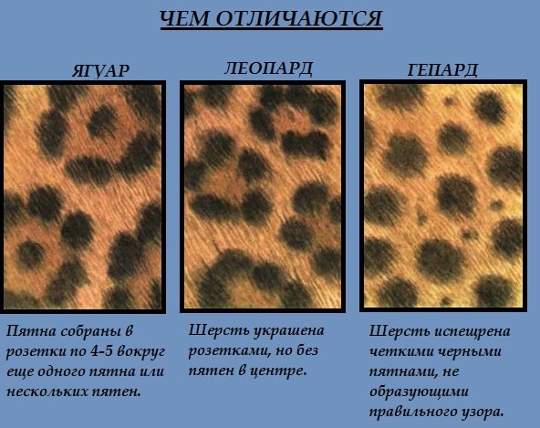 Окрас животных также различается. Если фоновый цвет тела у африканско-азиатских кошек – гепарда и ягуара – светло-жёлтый, то у их американского сородича ярко-рыжий или оранжевый. Благодаря подобному фону, ягуар выглядит гораздо ярче в сравнении с ними. Размер и форма пятен также отлична у всех трёх животных.
