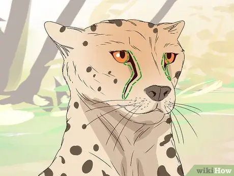 Отличается и окрас морды этих животных: у гепарда от уголков глаз вниз, по бокам носа и вдоль щёк идут вертикальные чёрные полосы.