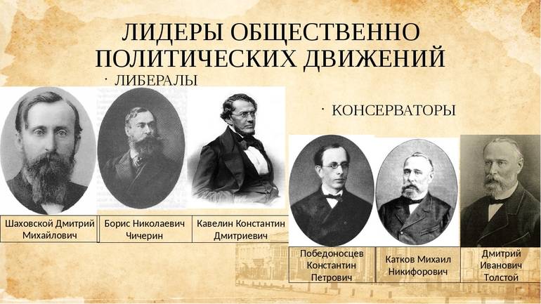 Во времена царской России власть стала консервативной после Французской революции. Исключениями были лишь начальные этапы правления Александра I и Александра II. Наиболее распространённым консерватизм стал во времена правления Александра III. Он считал, что его отец был убит из-за проведённых им либеральных реформ. Сам император решил подавить в народе тягу к переменам.