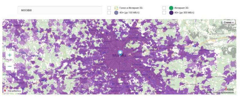 На официальном сайте мобильного оператора «Мегафон» также можно посмотреть зоны, в которых работает связь. Для примера мы выбрали Москву и Московскую область. Как и в случае с «МТС», сигнал есть в центре столицы и крупных населенных пунктах рядом с ней. Есть «белые пятна» и зоны, куда 4 «Джи» не пришел.