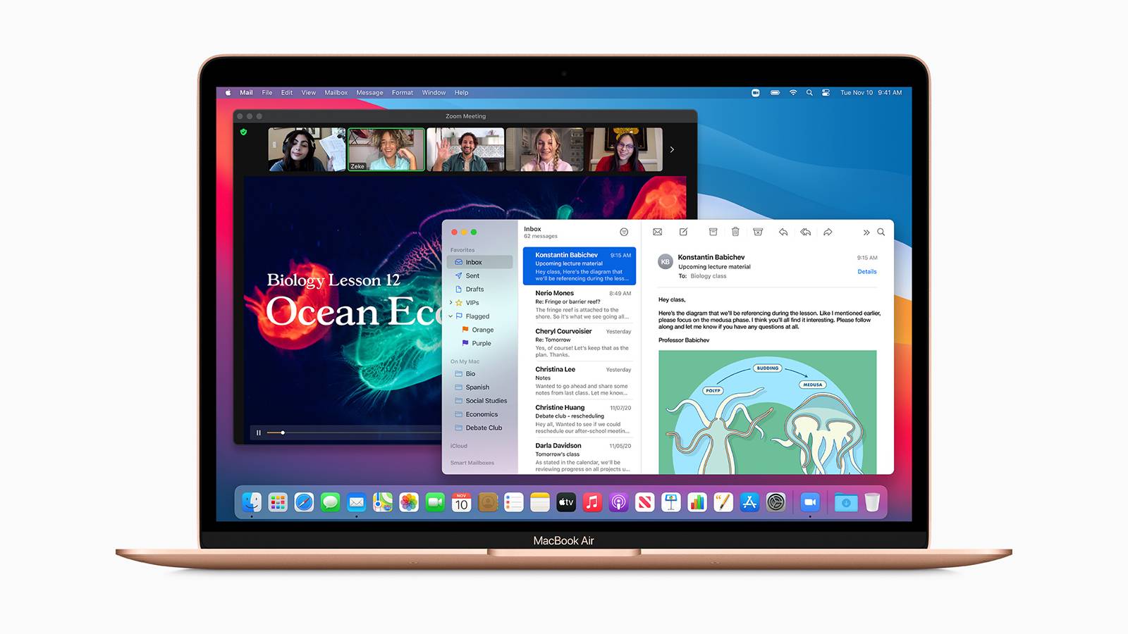 MacBook Air 2020 года наиболее примечателен тем, что стал первым ноутбуком Apple, перешедшим на собственные процессорные чипы компании — в данном случае M1, который также включает в себя собственный 16-ядерный нейронный движок и встроенный 7-ядерный графический процессор. Кроме того, ноутбук поставляется с 8 ГБ или 16 ГБ оперативной памяти и 256 ГБ, 512 ГБ, 1 ТБ или 2 ГБ встроенной памяти — достаточно вариантов, чтобы удовлетворить большинство пользователей.
