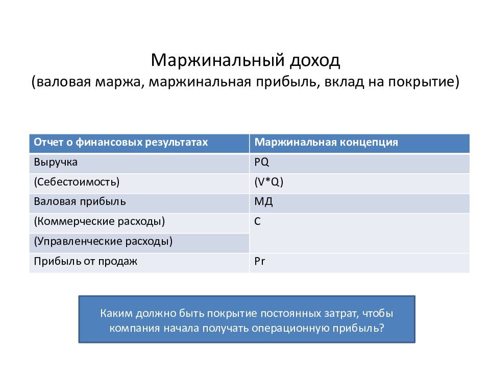 Маржа представляет собой финансовый результат, выявленный в результате уменьшения стоимости готовой продукции на произведенные на ее изготовления затраты.