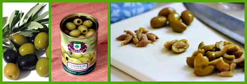 На фото хорошо видно цвет оливок и так называемых черных маслин.