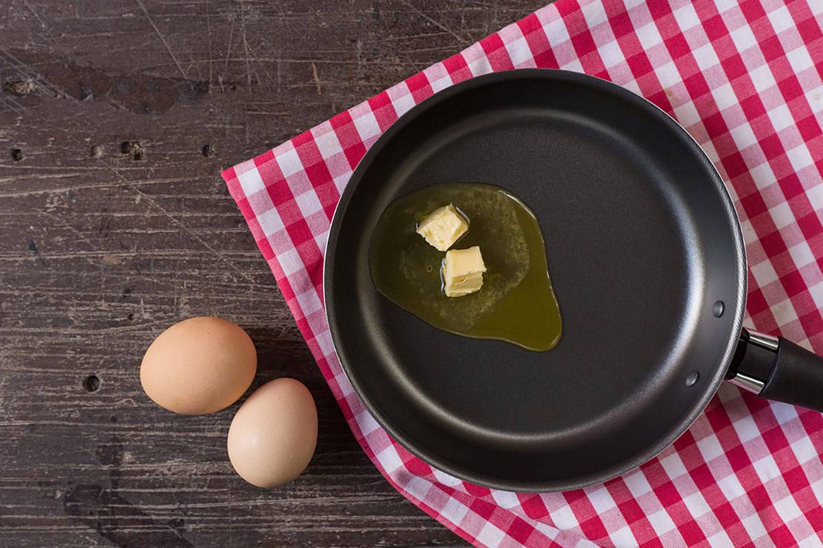 Поскольку обжарка яиц не подразумевает длительного времени или нагрева до высоких температур, можно использовать обычное сливочное масло — оно придаст омлету приятный сливочный вкус. Кроме этого, оно содержит важные витамины А и Е.