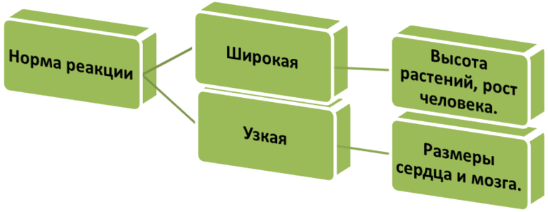 Пределы модификационной изменчивости называются нормой реакции. Различают широкую и узкую норму реакции. Признак, имеющий широкую норму реакции, изменяется в большом диапазоне. Например, количество молока у крупного рогатого скота зависит в значительной степени от условий содержания и кормления. Признак, имеющий узкую норму реакции, незначительно зависит от внешних условий, например окраска шерсти у крупного рогатого скота. Норма реакции определяется генотипом. Она складывалась историчсски в результате естественного отбора.