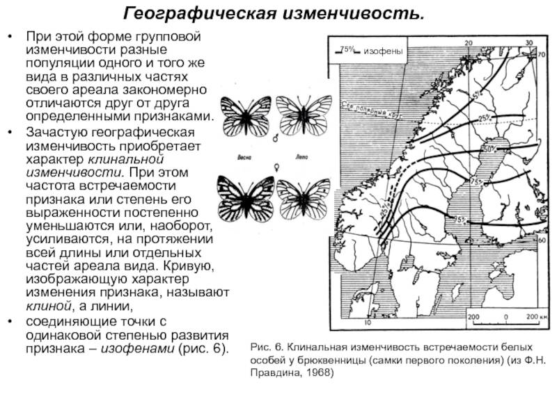 же вида в различных частях своего ареала закономерно отличаются друг от друга определенными признаками.Зачастую географическая изменчивость приобретает характер клинальной изменчивости. При этом частота встречаемости признака или степень его выраженности постепенно уменьшаются или, наоборот, усиливаются, на протяжении всей длины или отдельных частей ареала вида. Кривую, изображающую характер изменения признака, называют клиной, а линии, соединяющие точки с одинаковой степенью развития признака – изофенами (рис. 6).