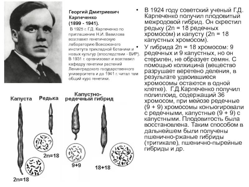 скрестил редьку (2n = 18 редечных хромосом) и капусту (2n = 18 капустных хромосом). У гибрида 2n = 18 хромосом: 9 редечных и 9 капустных, но он стерилен, не образует семян. С помощью колхицина (вещество разрушает веретено деления, в результате удвоившиеся хромосомы остаются в одной клетке). Г.Д.Карпеченко получил полиплоид, содержащий 36 хромосом, при мейозе редечные (9 + 9) хромосомы конъюгировали с редечными, капустные (9 + 9) с капустными. Плодовитость была восстановлена. Таким способом в дальнейшем были получены пшенично-ржаные гибриды (тритикале), пшенично-пырейные гибриды и др.