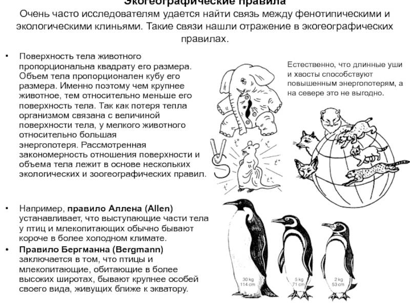 Поверхность тела животного пропорциональна квадрату его размера. Объем тела пропорционален кубу его размера. Именно поэтому чем крупнее животное, тем относительно меньше его поверхность тела. Так как потеря тепла организмом связана с величиной поверхности тела, у мелкого животного относительно большая энергопотеря. Рассмотренная закономерность отношения поверхности и объема тела лежит в основе нескольких экологических и зоогеографических правил.Например, правило Аллена (Allen) устанавливает, что выступающие части тела у птиц и млекопитающих обычно бывают короче в более холодном климате.Правило Бергманна (Bergmann) заключается в том, что птицы и млекопитающие, обитающие в более высоких широтах, бывают крупнее особей своего вида, живущих ближе к экватору.