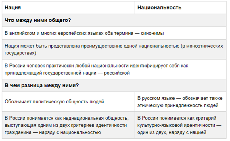 Основным отличием нации от национальности сегодня считается то, что в русском языке нация чаще всего означает политическую общность людей, а национальность – их этническую принадлежность. В России люди определяют свою идентичность по обоим признакам.
