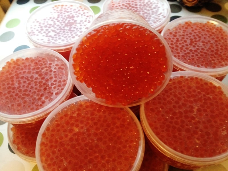 Если очень внимательно присмотреться, то можно увидеть, что у искусственной икры внутри есть миниатюрные пузырьки воздуха, и они плавают. Но это еще зависит от качества продукции.