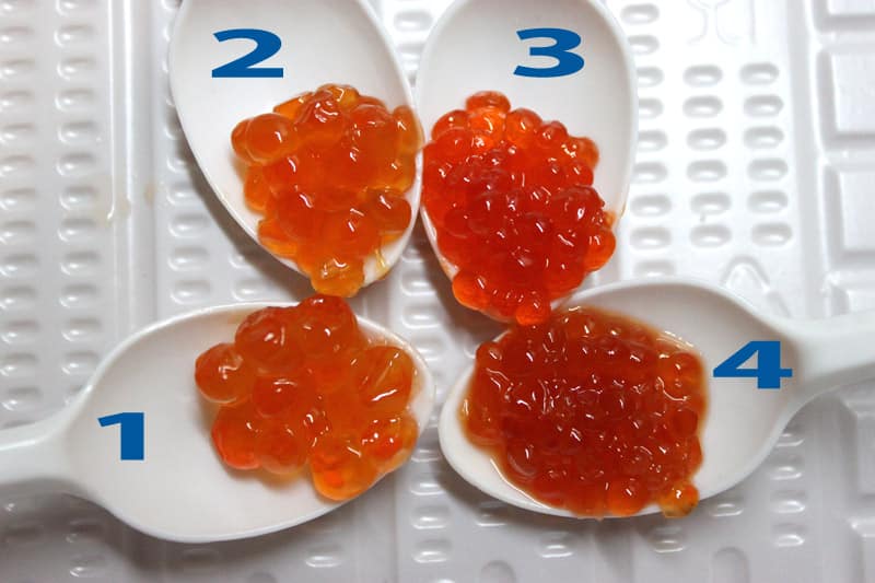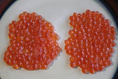 Поддельная икра из морских водорослей и рыбного бульона часто почти желтого цвета, более жесткая. Сами икринки словно состоят из желатина и не имеют пятнышек “зародышей”.